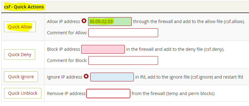 – İkinci seçenek olarak WHM/cPanel kontrol paneli içinde Plugins »ConfigServer Security & Firewall bölümünde Quick Allow kısmında ki boşluğa IP adresinizi yazarak Quick Allow bastığınızda internet IP adresinizi sistemde güvenli listeye eklemiş olacaksınız.