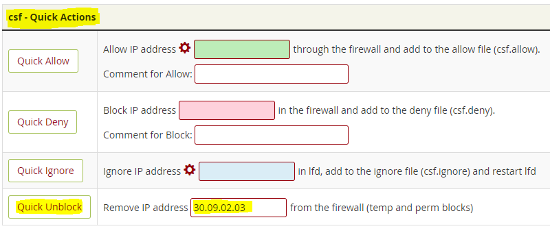 – İlk seçenek olarak WHM/cPanel kontrol paneli içinde Plugins »ConfigServer Security & Firewall bölümünde Quick Ublock kısmında ki boşluğa IP adresinizi yazarak Quick Ublock bastığınızda engelli internete çıkış IP adresinizi silebilirsiniz. Veya Flush all Blocks kısmından Return diyerek engelli IP listesini komple temizlemiş olursunuz.