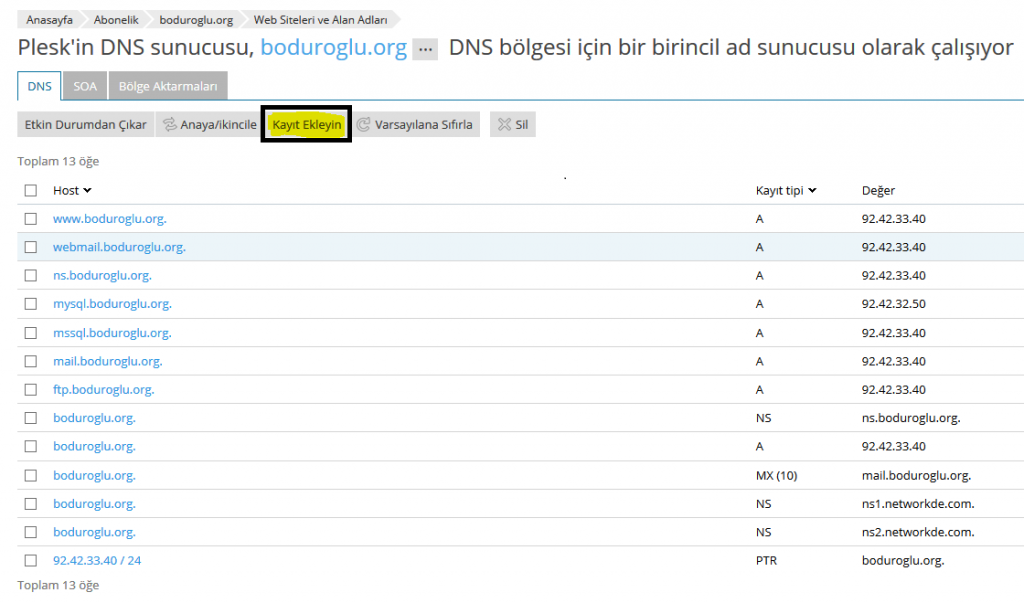 Alan adınızın hosting plesk paneline giriş yaparak, DNS ayarları kısmından SRV kaydı oluşturmak için “Kayıt Ekleyin” sekmesine tıklıyoruz.